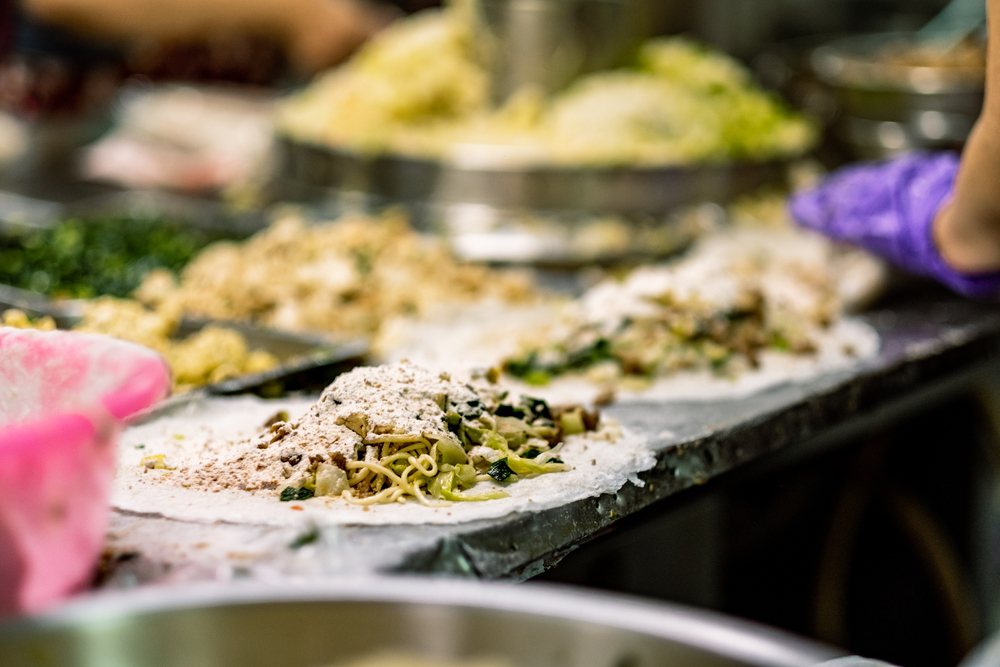 南部的春捲也顯少見到紅燒肉,不同於北部川燙高麗菜與豆芽菜的濕潤做法,餡料多半是炒過的韭菜花、豆干、蛋絲、菜脯、油麵、豆芽菜與高麗菜絲,加入芹菜與香菜點綴,以大量的蔬菜為主,有些店家還會淋一點肉燥,最後豪邁地撒上混了花生粉的糖粉,吸收春捲的濕氣,整體滋味偏甜。